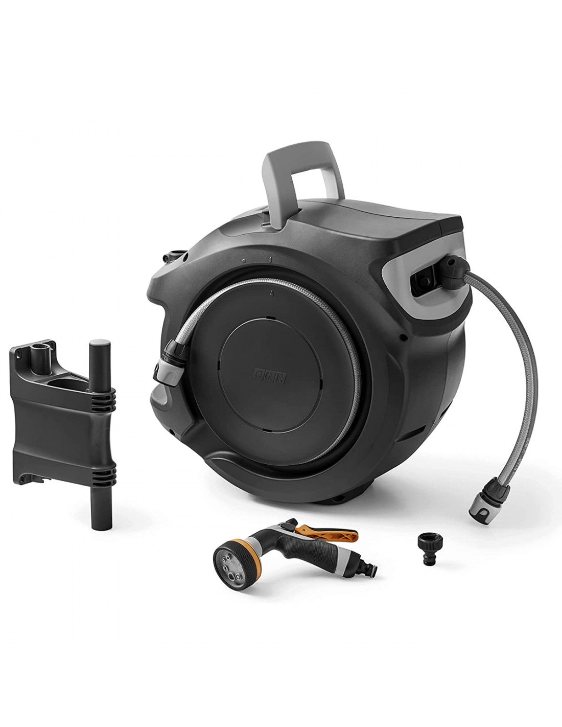 orientabile a 180∞ grazie alla staffa a muro. Automatico. Permette il bloccaggio del tubo nella posizione pi˘ comoda e vicina al punto di irrigazione. assicura il riavvolgimento lento e senza strattoni del tubo. Completo di:? 25 m di tubo rinforzato da ??