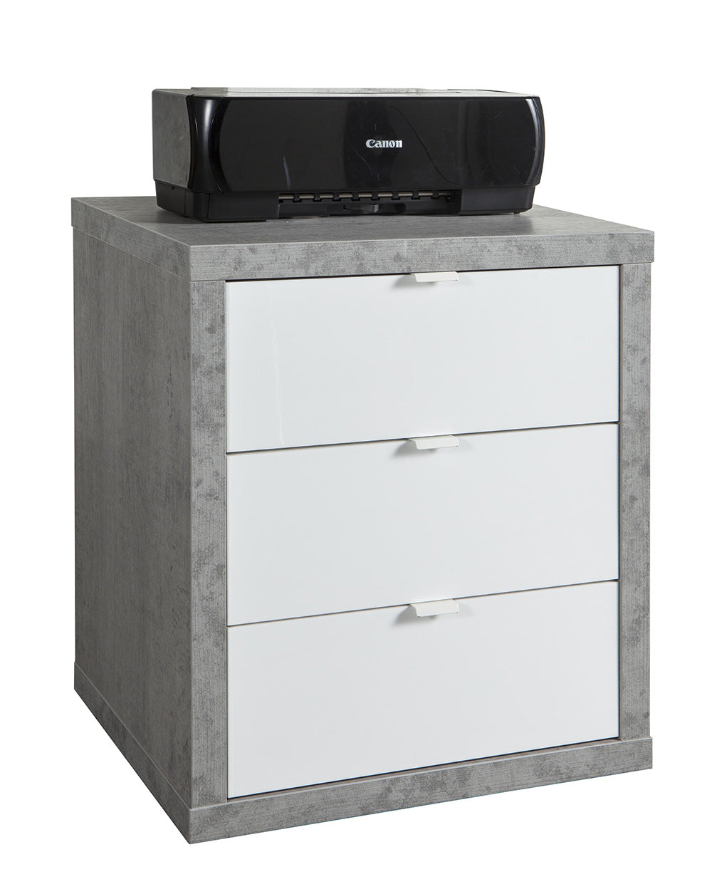 Art. CT0737 K561 linea Pratico a tre cassetti con struttura in truciolare rivestito in melaminico. Dimensioni 55 x 45 x h 66 cm. Colore struttura cemento e frontale cassetti bianco. Da montare.